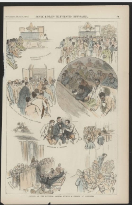 Newly enfranchised African American citizens, thronging the interior of the Capitol building after Reconstruction, were depicted in Frank Leslie’s periodical: