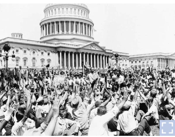 I mention the massing of the Bonus Army on the Capitol steps in 1932, to note that the dominant narrative around Jan 6 today, often implies that it is an act of violence or of “insurrection” simply to march en masse peacefully to the Capitol.