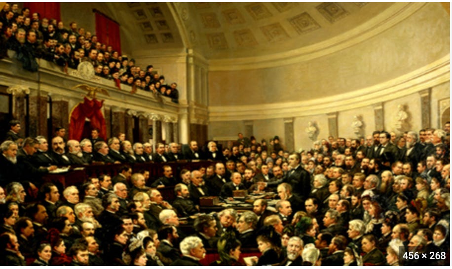 This, above, is the Electoral Commission of 1877, with the public crowding the gallery, as the outcome of the contested Rutherford/Tilden Presidential election was decided. [https://constitutioncenter.org/blog/looking-back-the-electoral-commission-of-1877]
