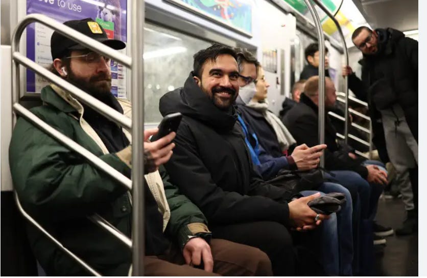 In New York City media, in contrast, Mamdani poses in a hoodie on the subway: