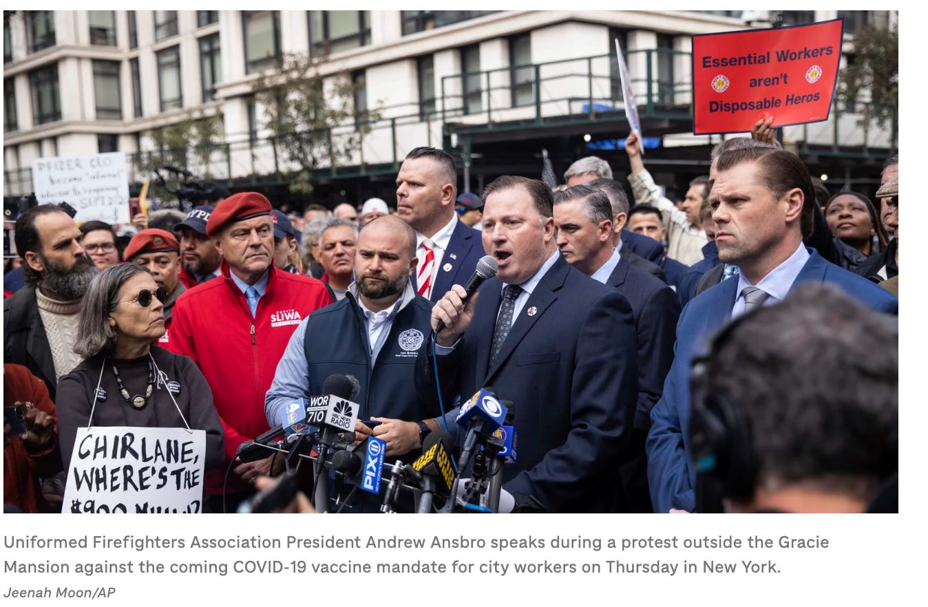 Firefighters resisted this injustice against them all: they protested outside Gracie Mansion, the Mayor’s residence, against the mandate: they bore signs reading “Essential Heroes Aren’t Disposable.”