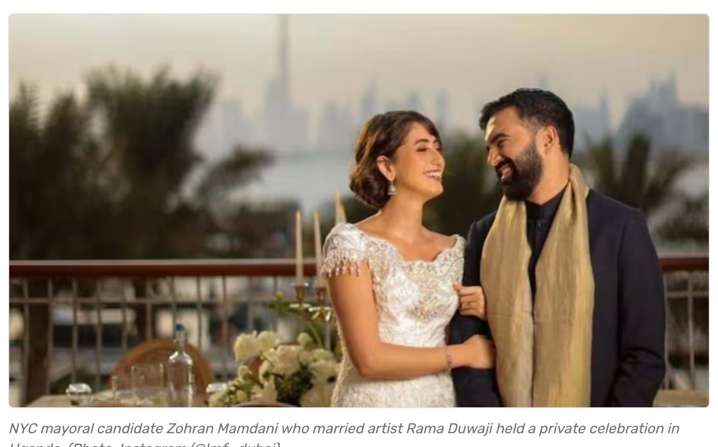 Mamdani is to the manor born. A Bowdoin college graduate, son of the glamorous Indian filmmaker Mira Nair, Mamdani’s family lives in Uganda, where Mandani was recently married. Indian media are reporting this event as a “lavish Uganda wedding bash”. “New York City mayoral frontrunner and current Queens Assemblyman Zohran Mamdani celebrated his recent marriage with a three-day private celebration at his family's high-security estate in Uganda”, reports DNA_India.