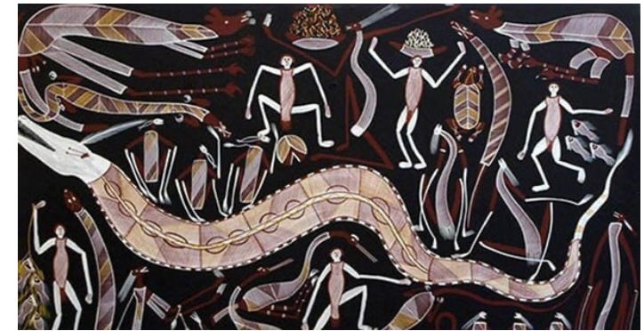 “[M]any Chinese people still believe in "dragon lines" and feng shui. The Incas used "spirit-lines" or ceques with the Inca temple of the sun in Cuzco as their hub, marking the routes with wak’as, stone monuments that represent something revered. For the Aboriginal people of Australia, songlines, also called "dreaming tracks", are paths across land and sky, which mark the routes followed by localised "creator beings". The paths are recorded in traditional songs, stories, dance and painting; by singing these songs in sequences, indigenous people can navigate the deserts of Australia's interior.” In Australia, aboriginal people believe that creators’ active dreaming, brings order out of the void.