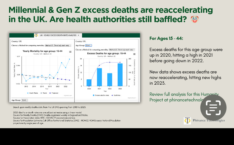 [So,] when we run the population of this age group in the United Kingdom that’s 650,000 people who could potentially become disabled [from myocarditis] or dead. Say only ten per cent develop problems — that is 65,000 people in the UK. We are updating 2023 — their UK 15-44 age group’s excess mortality is 20 per cent above there baseline, reaching a new all-time high in 2023. It shot to a new high in 2023. Whatever is going on with this vaccine has medium term effects.