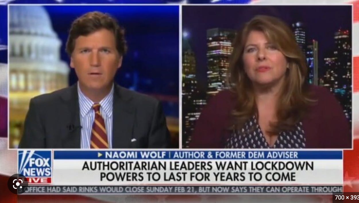 Here is Mr Ben Dixon, from the left, asserting that I must be not a feminist because I am “talking to Tucker Carlson” who “100 per cent is an anti-feminist”. He assails “this BS from Naomi Wolf and Tucker Carlson” — “BS” — in which I warned that we were heading into an un-American two-tier discrimination society based on vaccination status.