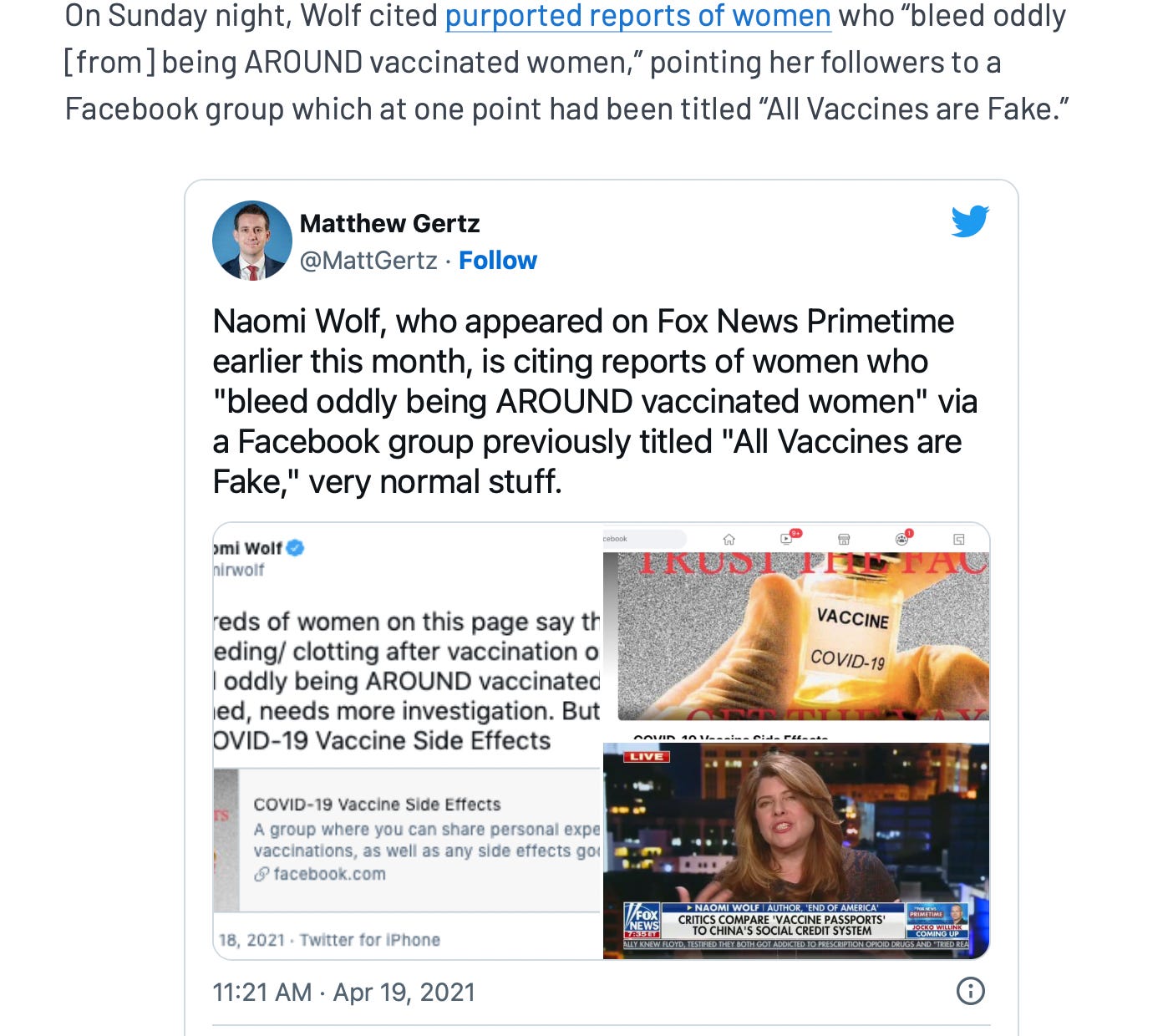 Gertz described multiple independent reports of menstrual problems from women as “purported reports” - a misogynist thing to do, mocking women’s eyewitness descriptions of their own symptoms, and one with a long history in medicine’s and Pharma’s crimes against women - and he shamefully singled out the (accurate) tweet of mine, that we now know via a lawsuit, the White House, the CDC, DHS, Twitter and Facebook had illegally colluded to target and smear.
