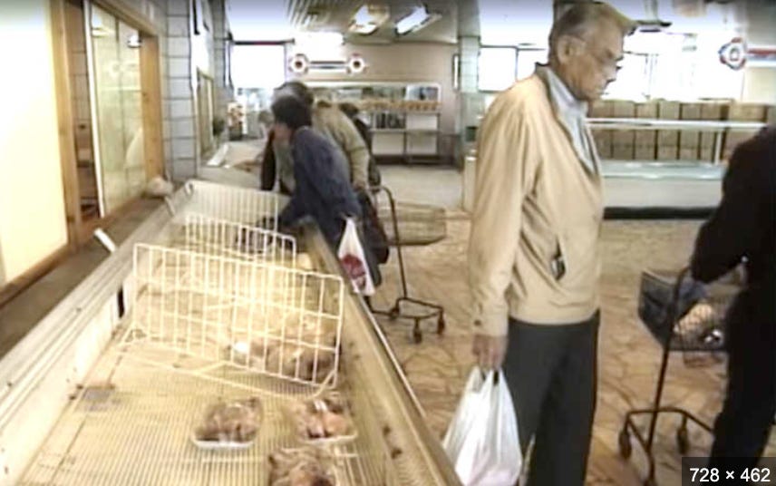 As for state-run grocery stores? We have seen those in the Soviet Union. Many New Yorkers who immigrated from that tyranny, remember the experience of waiting in endless lines for inadequate state-managed groceries. This is what that looks like — a Soviet grocery store in the 1990s: